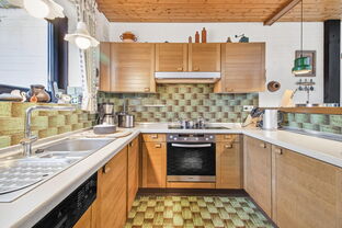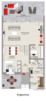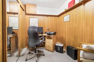 Die derzeitigen Eigentümer haben sich für ein großes Wohnzimmer mit angrenzendem Büro, einer offenen Küche und zwei Schlafzimmern entschieden. Neben den Wohnräumen gibt es ein Vollbad mit Oberlicht, ein Gäste-WC sowie ein Vorratsraum und eine Werkstatt.