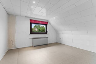 Im Obergeschoss befinden sich zwei Zimmer sowie der Aufgang zum Spitzboden. Der Spitzboden beinhaltet einen wohnlich ausgebauten Raum.