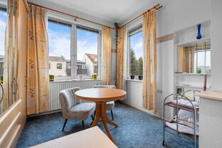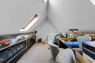 Über eine Treppe gelangen Sie in ein kleines, ausgebautes Dachstudio, das als Hobbyraum, Homeoffice oder zusätzlicher Rückzugsort genutzt werden kann.