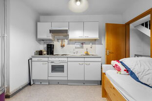 Das Obergeschoss beeindruckt mit einem großzügigen Wohnraum, der zum Entspannen oder geselligen Beisammensein einlädt. Hier befindet sich außerdem eine Küche sowie ein separates Gäste-WC, das den Wohnkomfort abrundet.