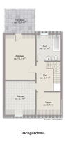 Im Dachgeschoss erwartet Sie ein weiteres Zimmer mit direktem Zugang zur sonnigen Dachterrasse, die einen herrlichen Rückzugsort im Freien bietet. Ebenfalls auf dieser Ebene befinden sich eine Küche und ein Badezimmer, sodass hier eine eigenständige Wohneinheit möglich ist.