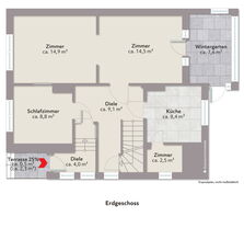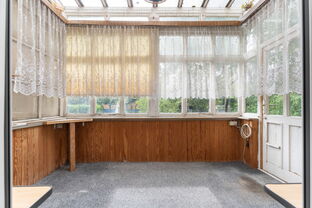 Das Erdgeschoss empfängt mit einem großzügigen Wohnzimmer, einem zusätzlichen Zimmer sowie direktem Zugang zum Garten und zum Wintergarten. Die angrenzende Küche verfügt über einen praktischen Abstellraum.