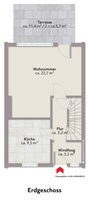 Im Erdgeschoss befinden sich der Flur, ein helles Wohnzimmer mit Zugang zum großen Balkon sowie die Küche.