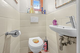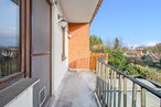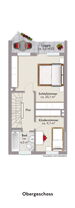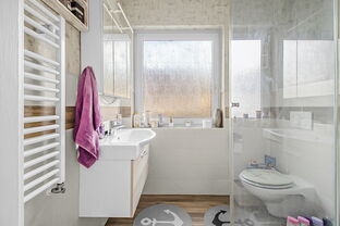 Über die Treppe erreichen Sie das Obergeschoss, das mit einem großen Schlafzimmer mit direktem Zugang zur Loggia ausgestattet ist. Zudem ist ein Kinderzimmer und ein großzügiges Badezimmer vorhanden. Das Badezimmer bietet Platz, ist modern gestaltet und komfortabel.