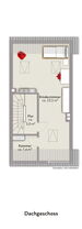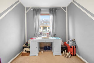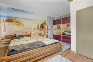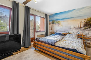 Das ausgebaute Dachgeschoss beherbergt ein großes Schlafzimmer mit einer angenehmen Wohnatmosphäre. Dank der Dachschrägen und der Fenster entsteht ein heller und gemütlicher Rückzugsort, der viel Platz zur modernen und angepasster Gestaltung bietet.