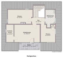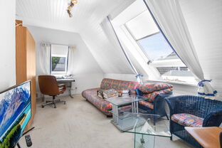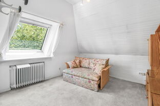 Im Dachgeschoss befinden sich ein großes Schlafzimmer mit Zugang zum Balkon und angrenzender Ankleide, zwei weitere Zimmer sowie ein Tageslichtbad mit Dusche und Badewanne.
