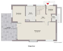 Im Erdgeschoss betreten Sie das Haus über einen Windfang, der in die zentrale Diele führt. Von hier aus gelangen Sie in sämtliche Räume des Erdgeschosses: in das Gäste-WC, die Küche, das angrenzende Esszimmer sowie in das großzügige Wohnzimmer mit offenem Kamin und direktem Zugang zur sonnigen Terrasse.