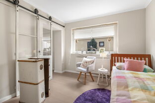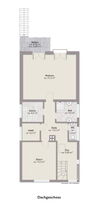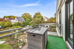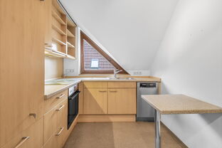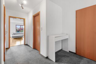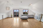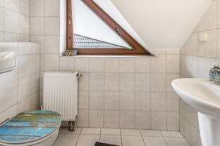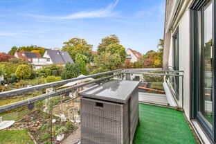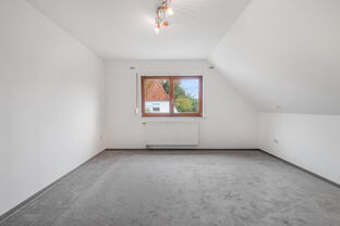 Die obere Wohneinheit verfügt über zwei Zimmer, ein Badezimmer, ein separates Gäste-WC sowie eine Küche. Vom Wohnzimmer aus führt der Zugang auf den Westbalkon, der einen angenehmen Blick ins Grüne bietet – ein idealer Ort zum Entspannen.