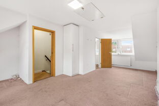 Das Dachgeschoss mit zwei Erkern ist vollständig ausgebaut und umfasst ein großes, helles Zimmer sowie ein Duschbad.