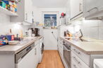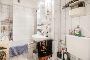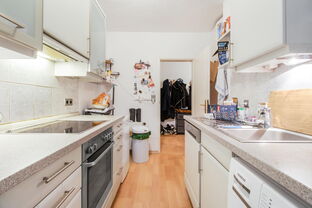 Die Küche bietet ausreichend Platz und verfügt zusätzlich über eine kleine Abstellkammer bzw. Speisekammer, die für extra Stauraum sorgt. Das innenliegende Badezimmer ist hell gefliest und mit Badewanne, Waschbecken und WC ausgestattet.