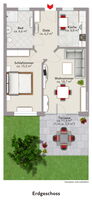 Die Wohnung ist so konzipiert, dass alle Räume bequem vom zentralen Flur aus erreichbar sind. Auf der linken Seite befindet sich eine geräumige Einbauküche. Rechts vom Flur liegt das moderne Badezimmer mit einer bodengleichen Dusche. Geht man den Flur weiter, gelangt man auf der linken Seite in das helle Wohnzimmer, das durch große Fenster und den direkten Zugang zur großzügigen Süd-West-Terrasse begeistert – ein perfekter Ort für erholsame Stunden im Freien. Auf der rechten Seite des Flurs befindet sich das gemütliche Schlafzimmer, das ebenfalls ausreichend Raum für individuelle Gestaltung bietet.
